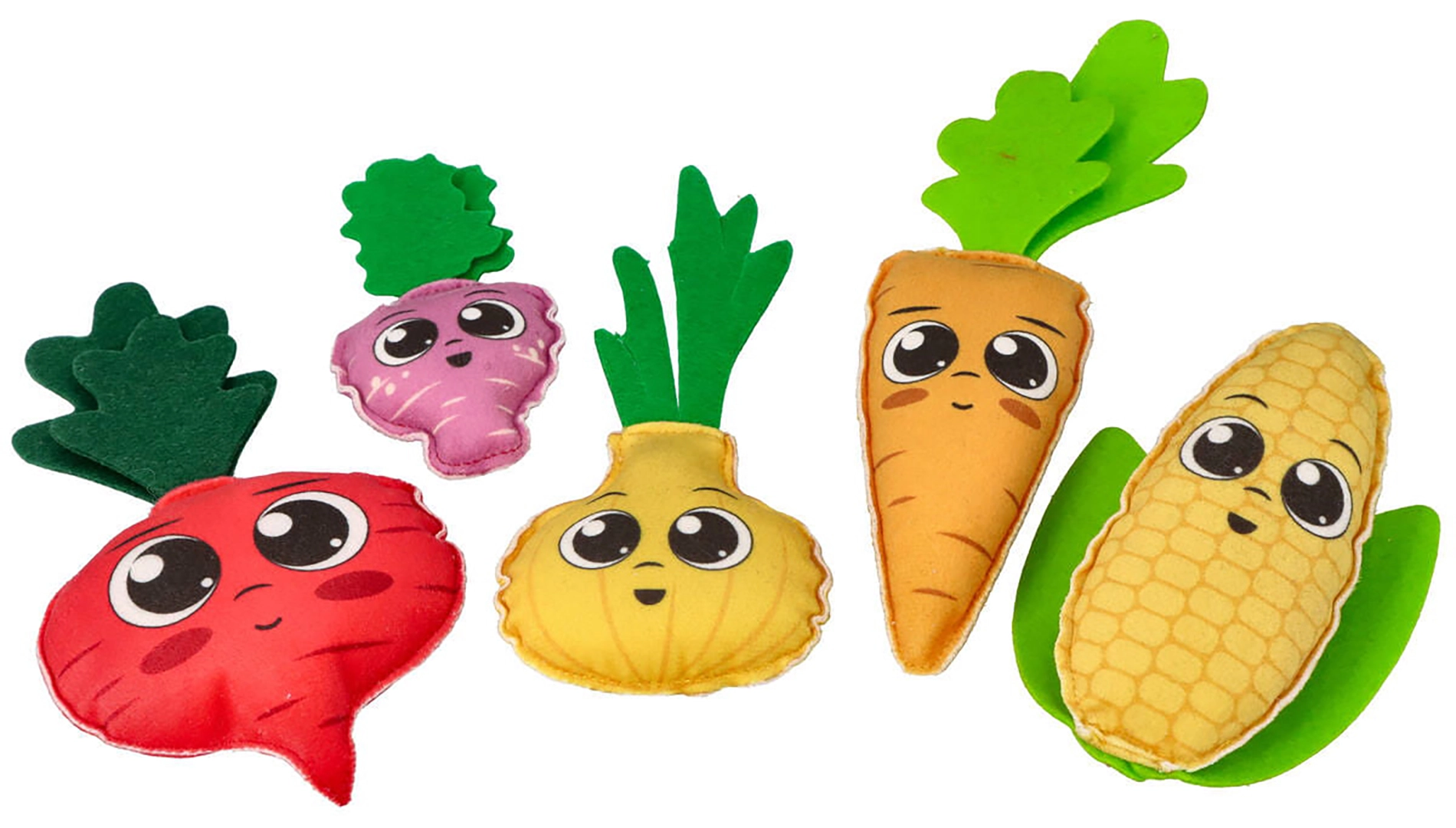 - 8 x realistycznie wykonane, miękkie warzywa (np. marchewka, pomidor, brokuł)