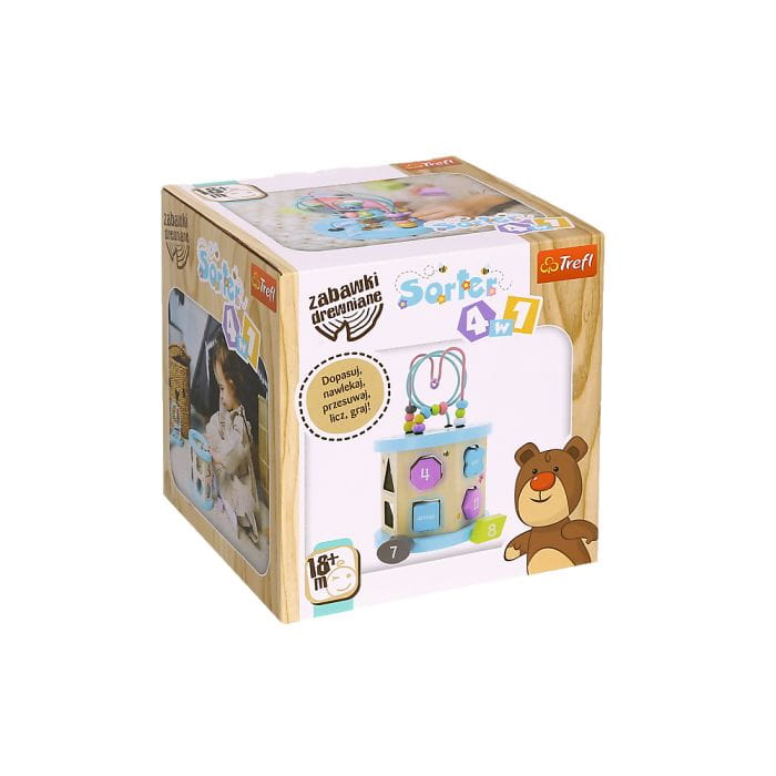 Zabawką ogólnorozwojowa dla najmłodszych. Edukacyjna zabawka już od 18 miesiąca życia. Sorter firmy Trefl został stworzony z myślą o najmłodszych wraz we współpracy z dziecięcym psychologiem. Zabawka drewniana angażuje dziecko do nauki poprzez zabawę. Sorter posiada otwory w kształtach klocków, tor kuleczkowy, sznureczek do nawlekania klocków, 12 kolorowych dwustronnych klocków o różnych kształtach. Delikatna kolorystyka wpływa pozytywnie na koncentrację dziecka, oraz działa uspokajająco. Zabawka posiada także prostą grę planszową z pionkami i kostką. Sorter wspiera motorykę małą dziecka.