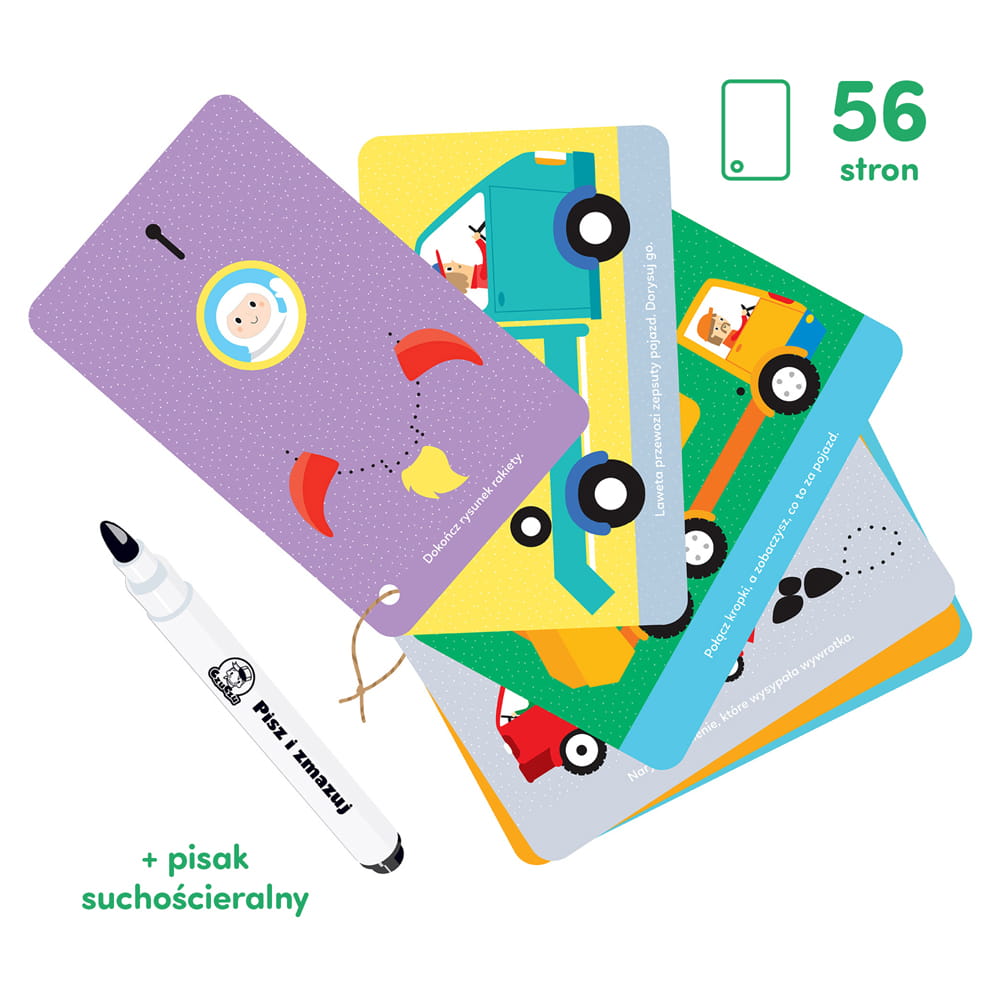 W opakowaniu: Książeczka i pisak suchościeralny.