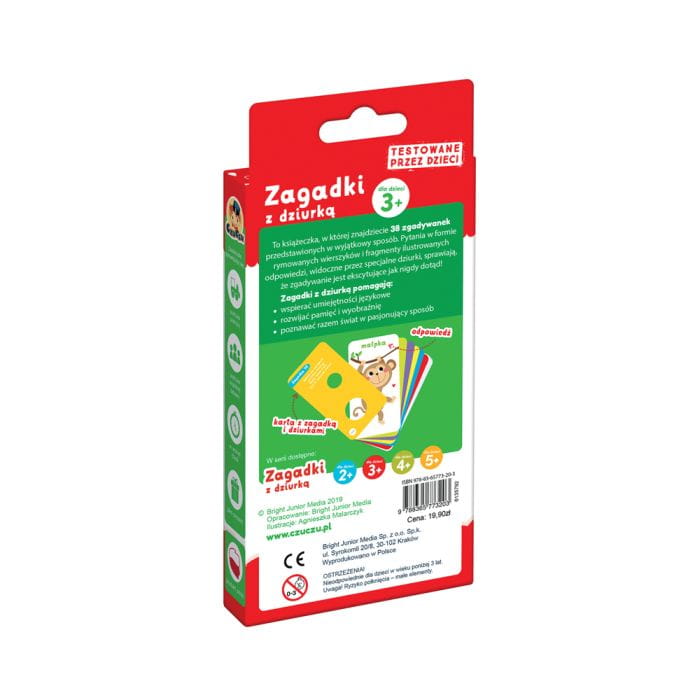Zagadki z dziurką to zestaw zagadek przeznaczonych dla dzieci w wieku 3 lat. Zagadki zostały zebrane w postaci książeczki, dzięki czemu zabawa jest jeszcze wygodniejsza. To jednak nie wszystko! Pytania, a także odpowiedzi są widoczne przez specjalne dziurki, co sprawia, że zabawa jest jeszcze bardziej oryginalna i wyjątkowa.